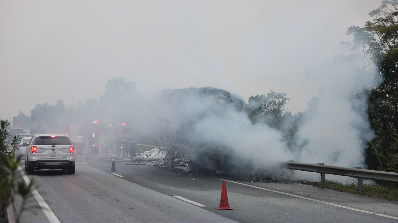 Hiện tại, đám cháy cơ bản được khống chế. Phần đầu xe được tách chốt nối và tháo rời khỏi rơ-moóc để ngăn cháy lan. Đầu kéo sau đó được đưa ra khu vực an toàn cách hiện trường vài chục mét, tạo khoảng trống cho lực lượng cứu hỏa tiếp cận và xử lý đám cháy.