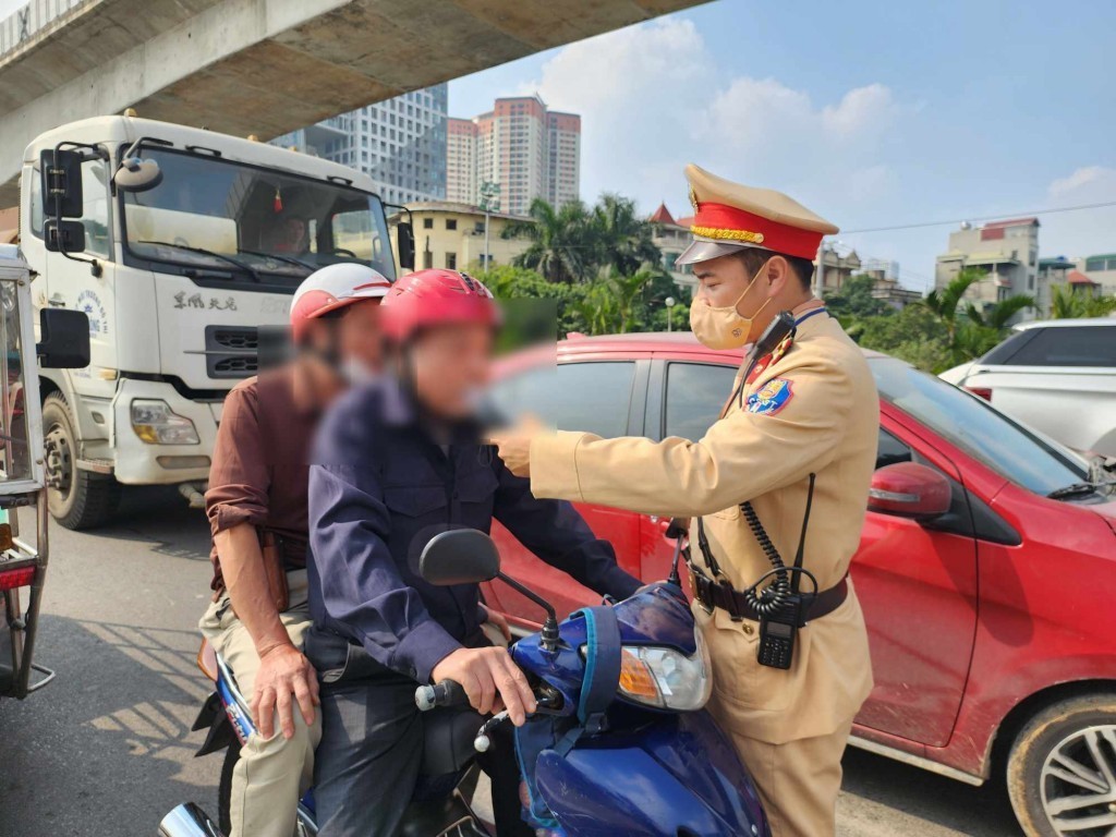 | Lực lượng Công an kiểm tra nồng độ cồn (Ảnh: Minh Phương) |