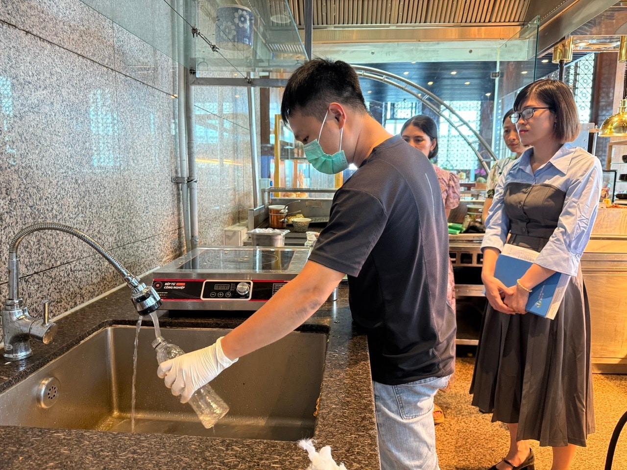 Cán bộ CDC Hà N giám sát , lấy mẫu xét nghiệm chất lượng nước tại các khách sạn trên địa bàn phục vụ A80. Ảnh: Duy Tuân