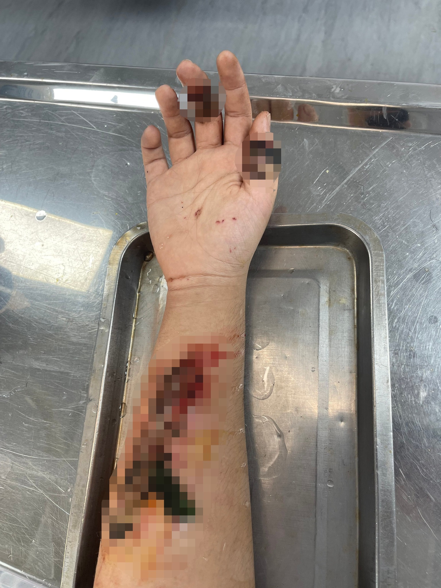 Ngay khi tiếp nhận người bệnh, các bác sĩ đã tiến hành khám lâm sàng đánh giá mức độ nguy hiểm của vết cắt trên cánh tay của người bệnh. May mắn người bệnh vận động được cổ bàn tay, ngón tay. Các bác sĩ nhanh chóng loại bỏ dị vật, làm sạch vết thương và khẩn trương lên phác đồ điều trị cho người bệnh; hẹn thay băng hàng ngày tại bệnh viện để theo dõi và đánh giá vết thương nhằm tầm soát các biến chứng nguy hiểm…