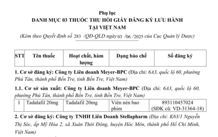(1) Tadalafil 20mg, viên nén bao phim - Cơ sở đăng ký: Công ty Liên doanh Meyer-BPC; Cơ sở sản xuất: Công ty Liên doanh Meyer-BPC (đều ở địa chỉ 643, quốc lộ 60, phường Phú Tân, thành phố Bến Tre, tỉnh Bến Tre, Việt Nam); số đăng ký: 893110457024 (SĐK cũ: VD-31364-18);